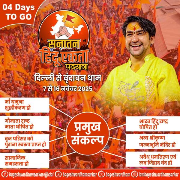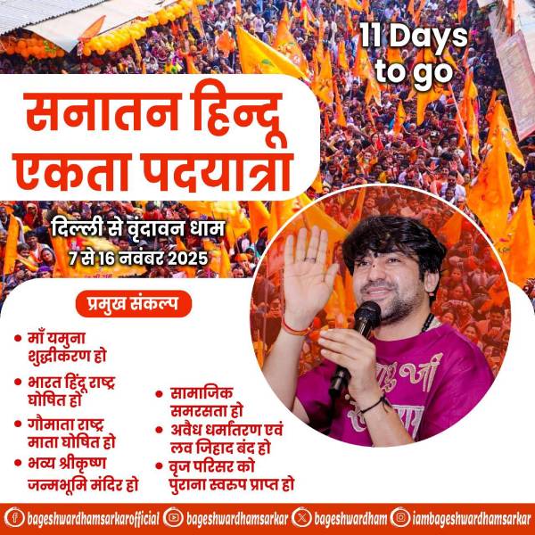 बागेश्वर धाम के पीठाधीश्वर पं. धीरेंद्र कृष्ण शास्त्री आगामी 7 नवंबर से दिल्ली से वृंदावन तक एक विशाल ‘सनातन हिंदू एकता’ पदयात्रा निकालने जा रहे हैं। दस दिवसीय यह यात्रा लगभग 170 किलोमीटर लंबी होगी और 16 नवंबर को वृंदावन पहुंचकर संपन्न होगी।